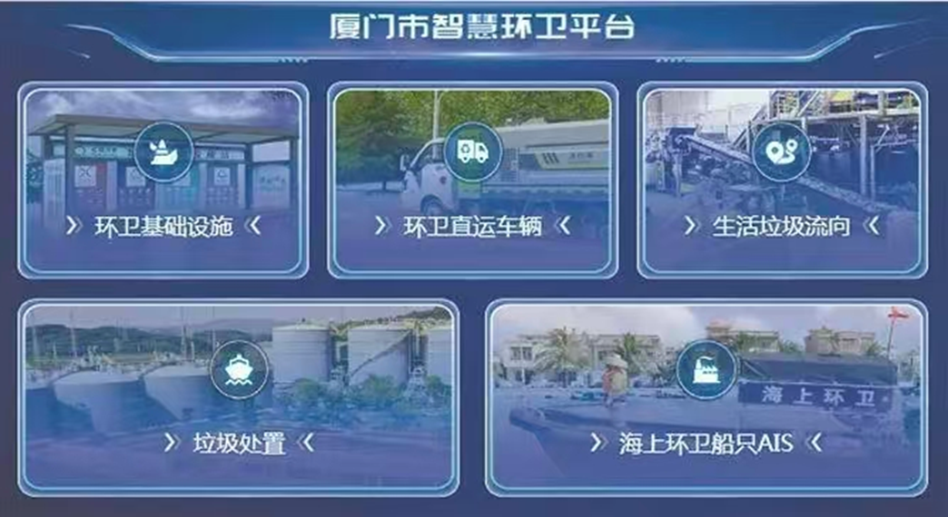 厦门市智慧环卫平台,涵盖生活垃圾分类、收运、处置、市容作业、海漂垃圾治理等核心业务管理功能