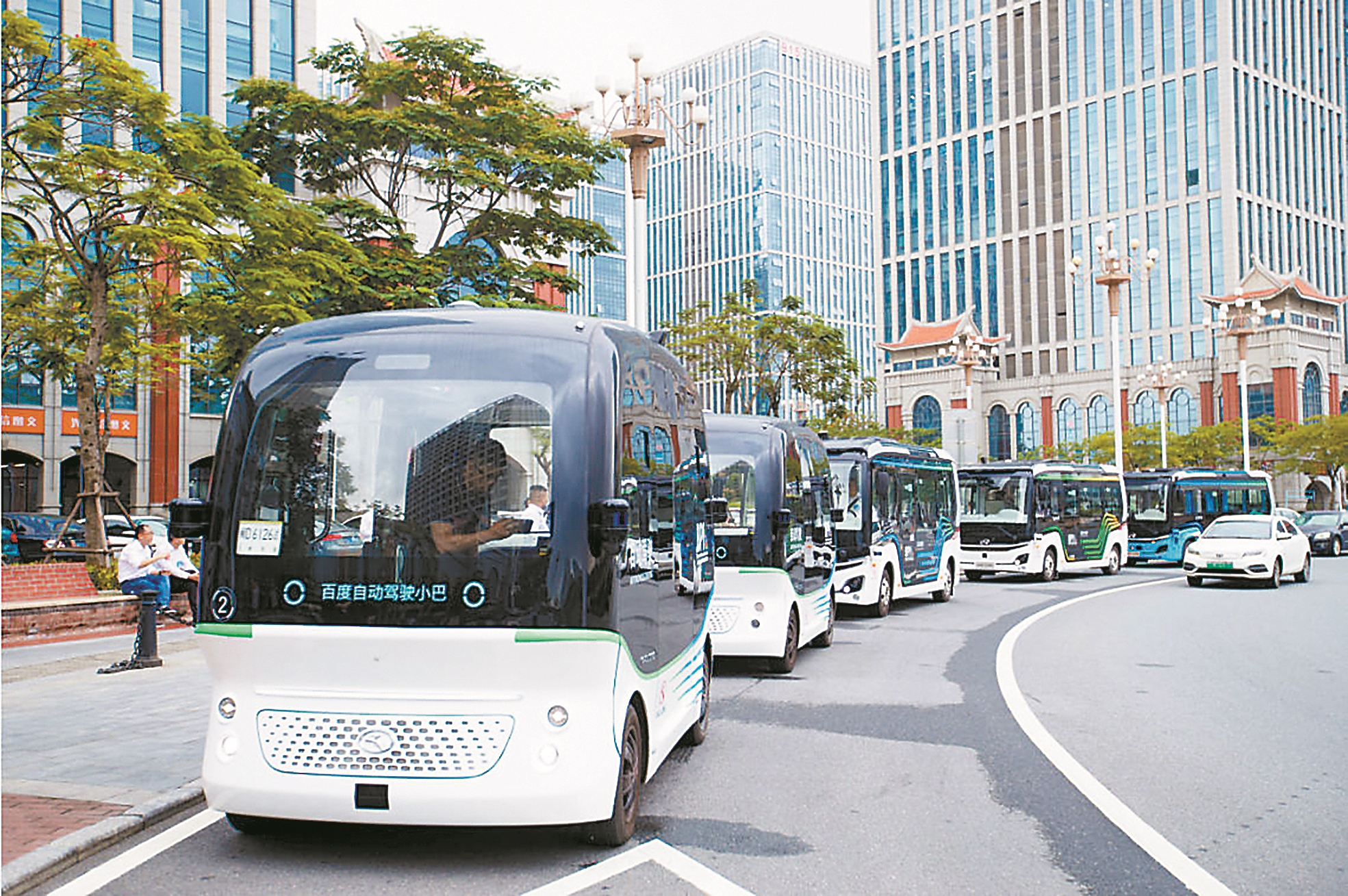 多款自动驾驶金龙巴士在厦门软件园三期行驶。 本报记者 施辰静 摄
