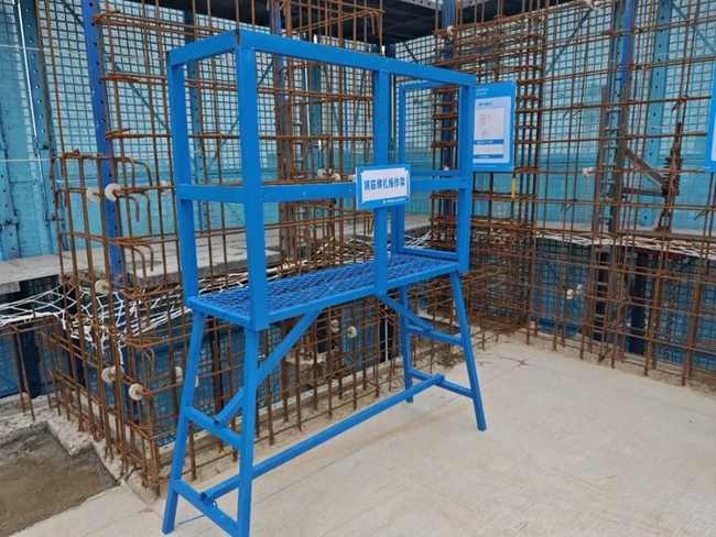 革新工艺提升精度效率。项目使用高强度圆型、G型等定型化成品混凝土垫块,相较于传统塑料垫块具有承重能力高、稳定性优且抗震性能强的优势。采用成品马凳固定钢筋位置,不仅安装便捷高效,还能精准控制保护层厚度。创新F型定位卡与梯子筋工艺,精准控制保护层误差±2mm以内,确保钢筋排布与保护层厚度精准控制。