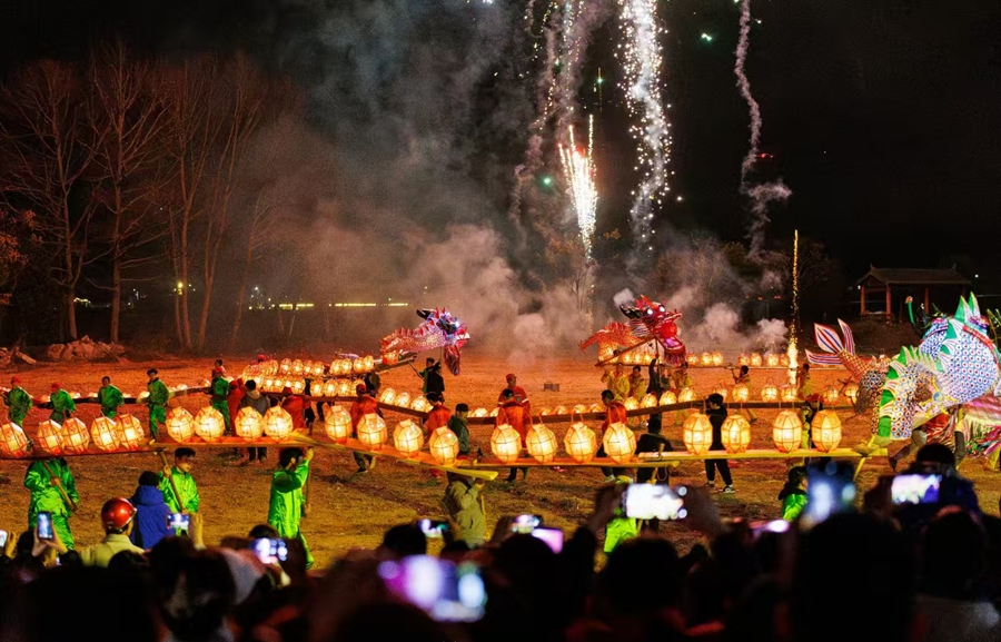 近日,长汀县一场“村晚”上的龙灯与烟花表演。