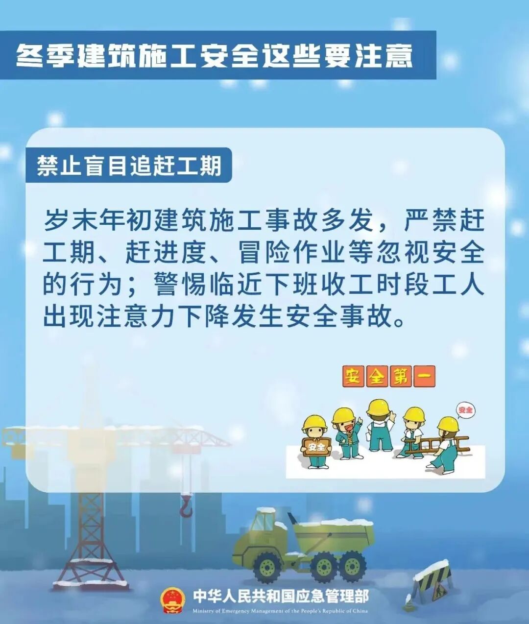 冬季常伴随着气温的骤降,建筑工地施工条件发生变化,特别是岁末年初,气候上的“寒冷期”、施工上的“抢工期”以及心理上的“节假期”,多重因素叠加,更容易引发各类安全事故,建设单位需要提前做好应对措施,加强小型工程安全监管,严格各项规范,准备相应物资,防患于未然,保障冬季建筑施工安全生产。