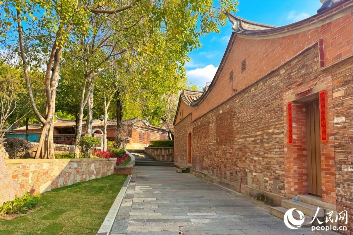 明媚的阳光下,红砖古厝与蓝天白云相映成趣。人民网记者 李唯一摄