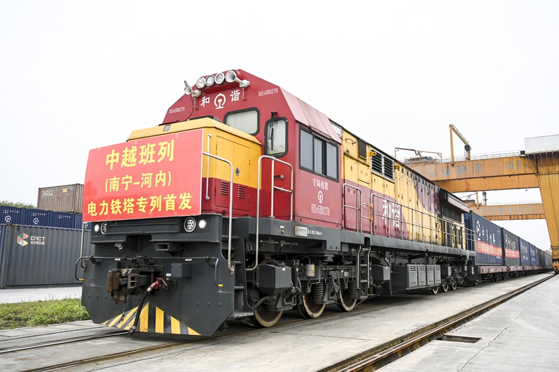 2024年3月8日,在广西南宁国际铁路港,电力铁塔专列准备发车。当日,一列满载340吨电力铁塔的中越班列从南宁国际铁路港开出,发往越南河内。新华社记者 曹祎铭 摄