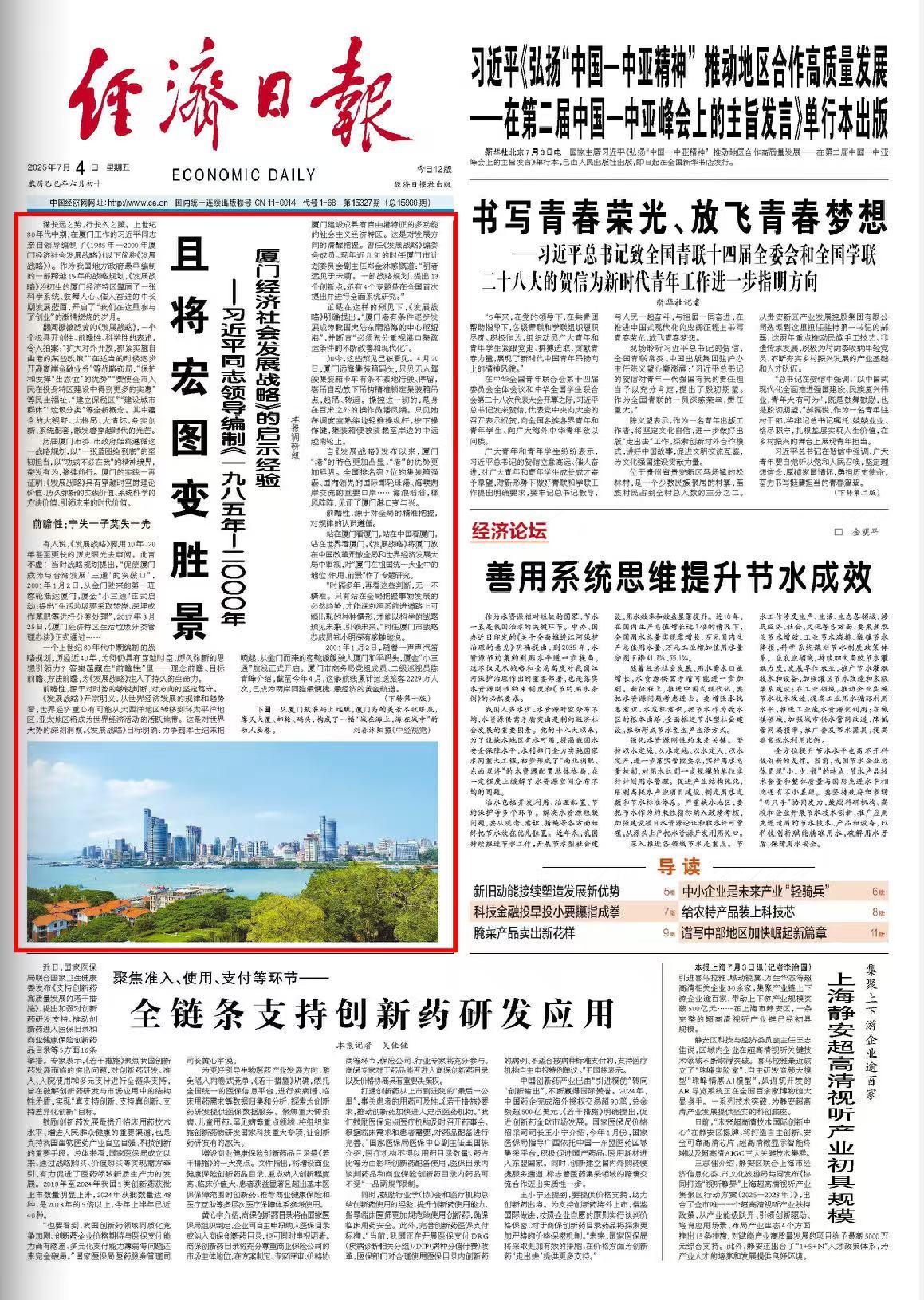 7月3日、7月4日,人民日报、新华社、中央广播电视总台、经济日报、中国日报等中央主要媒体在重要版面、主要新闻节目,集中报道习近平同志领导制定《1985年—2000年厦门经济社会发展战略》启示录。一起来看各家央媒的报道——