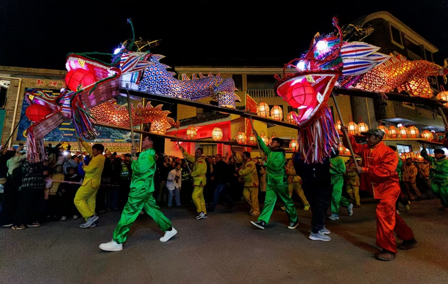 近日,长汀县一场“村晚”上的龙灯表演。