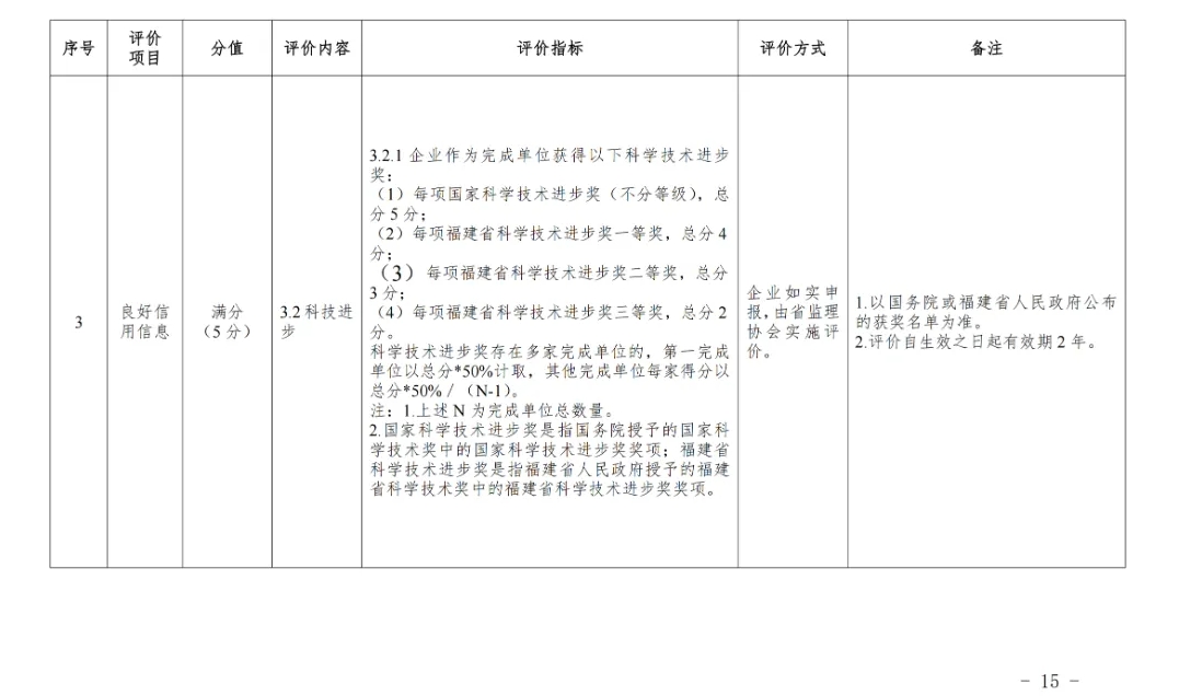 4.调整科技进步加分。科技进步奖存在多家参与单位的,从第一参与单位得总分、其他参与单位每家得总分*50%调整为:第一参与单位得总分*50%,其他参与单位按家数平均分配总分*50%。参照施工评价标准,取消标准编制加分。