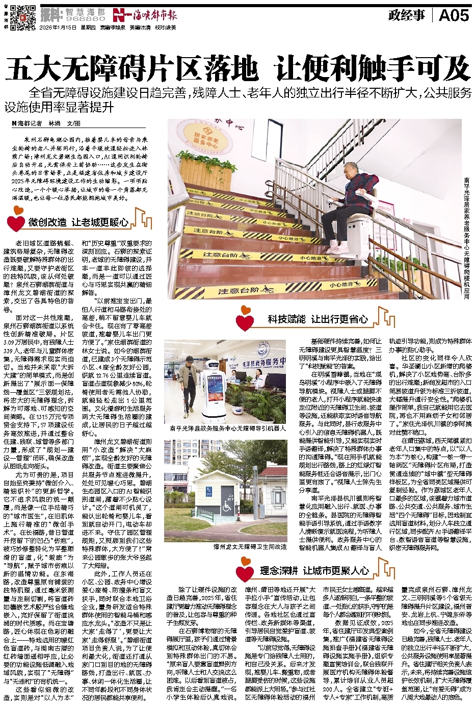 如今,全省无障碍建设日趋完善,残障人士、老年人的独立出行半径不断扩大,公共服务设施使用率显著提升。省住建厅相关负责人表示,未来,将持续完善设施维护长效机制,扩大无障碍覆盖范围,让“有爱无碍”成为八闽大地最动人的底色。