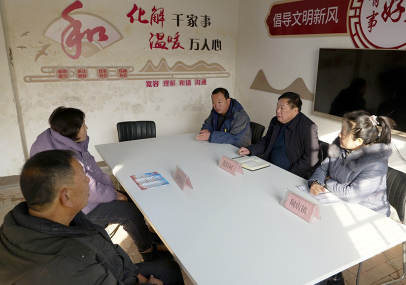 在宝丰县闹店镇范营村“摆理堂”,村镇干部(右)为村民进行信访调解(2023年12月20日摄)。河南省宝丰县积极推进四下基层工作深入开展,已打造闹店镇范营村“摆理堂”、石桥镇东大庄村“老娘舅茶室”等系列乡村社区服务阵地,协调邻里关系,有效化解各类矛盾,同时不断丰富工作内容,拓展服务功能,助力乡村振兴。新华社记者 李嘉南 摄