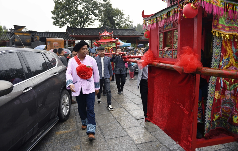苗族汉子施六金引领娶亲队伍进入十八洞村婚礼现场(2018年9月24日摄)。2014年以来,作为精准扶贫“首倡地”的十八洞村逐渐蜕变。十八洞村的大龄男青年“脱贫”又“脱单”。新华社记者 李尕 摄