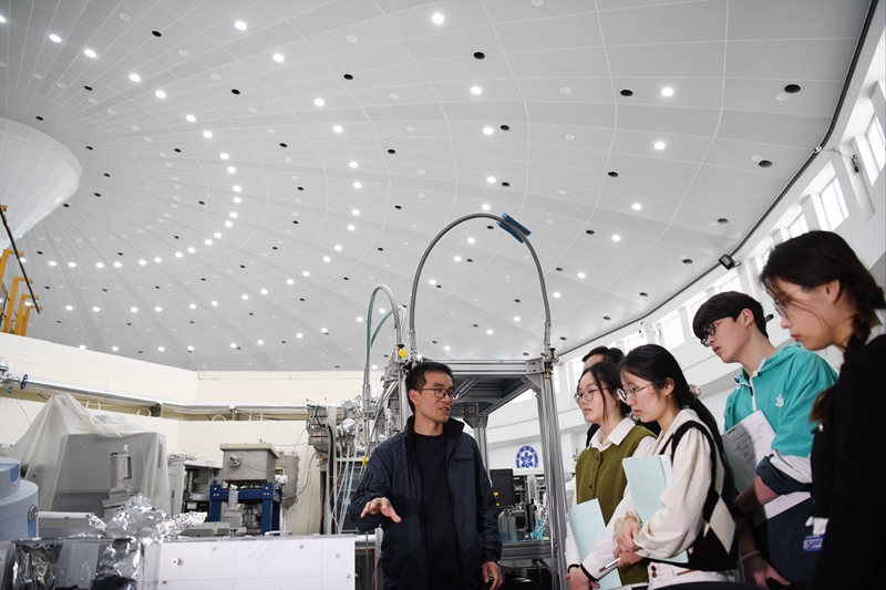 在中国科学技术大学国家同步辐射实验室,安徽省先进功能高分子薄膜工程实验室团队成员崔昆朋教授(左一)同学生交流(2024年4月6日摄)。新华社记者 张端 摄