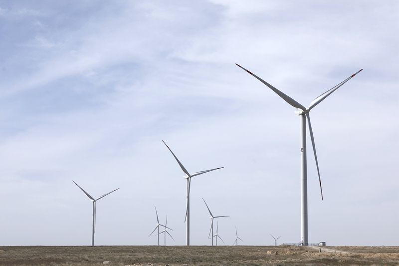 这是2023年4月3日在哈萨克斯坦札纳塔斯拍摄的札纳塔斯100兆瓦风电项目风机。新华社发(奥斯帕诺夫 摄)