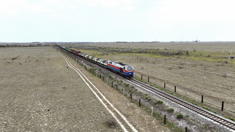 2023年5月12日,在哈萨克斯坦阿拉木图附近,货运列车驰骋于阿拉木图与中国霍尔果斯间(无人机照片)。新华社发(奥斯帕诺夫 摄)