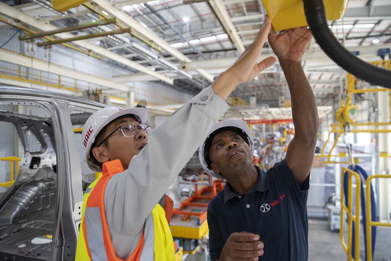 2023年5月9日,在南非东开普省北汽南非工厂,电工邦加尼(右)与中国同事方龙在焊装车间内工作。新华社记者 张誉东 摄