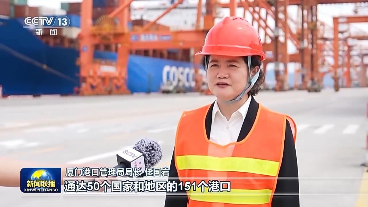 厦门港口管理局局长 任国岩:我们目前开通集装箱班轮航线184条,通达50个国家和地区的151个港口,成为巩固拓展国内国际双循环的重要节点、重要通道。