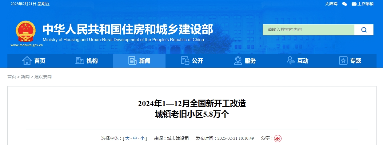 2024年1-12月全国新开工改造城镇老旧小区5.8万个
