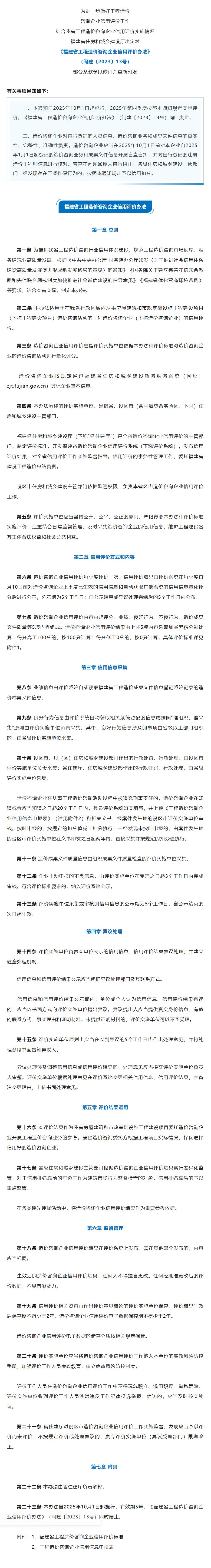 省住建厅重新印发《福建省工程造价咨询企业信用评价办法》