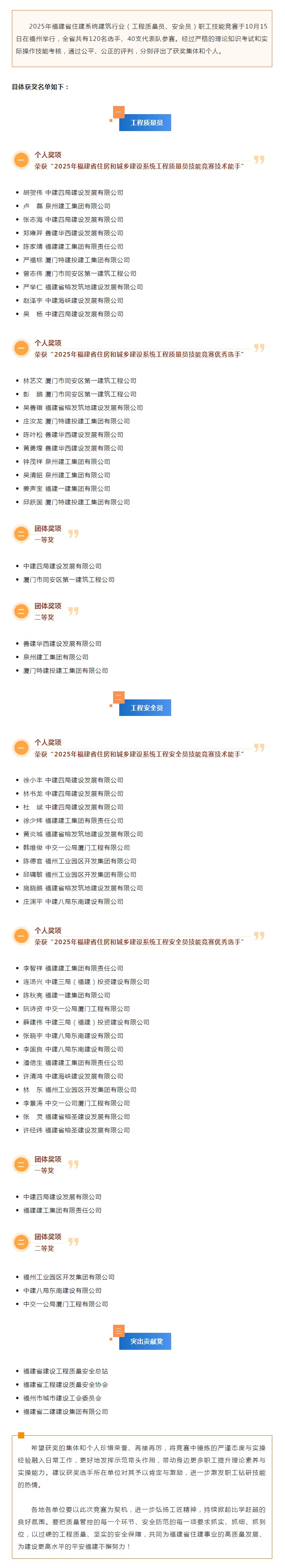 2025年福建省住建系统建筑行业(工程质量员、安全员)职工技能竞赛结果出炉!