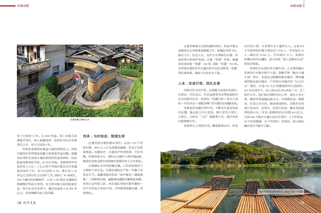 集中连片上注重品牌示范。在住房城乡建设部的大力支持下,福建省有6个县(区)纳入国家级示范县,是全国获示范县最多的省份之一。前2批的4个示范县,聚焦“人才联动、产业联合、文化传承、生态保护”积极创新实践,取得了明显成效,起到了示范效应。