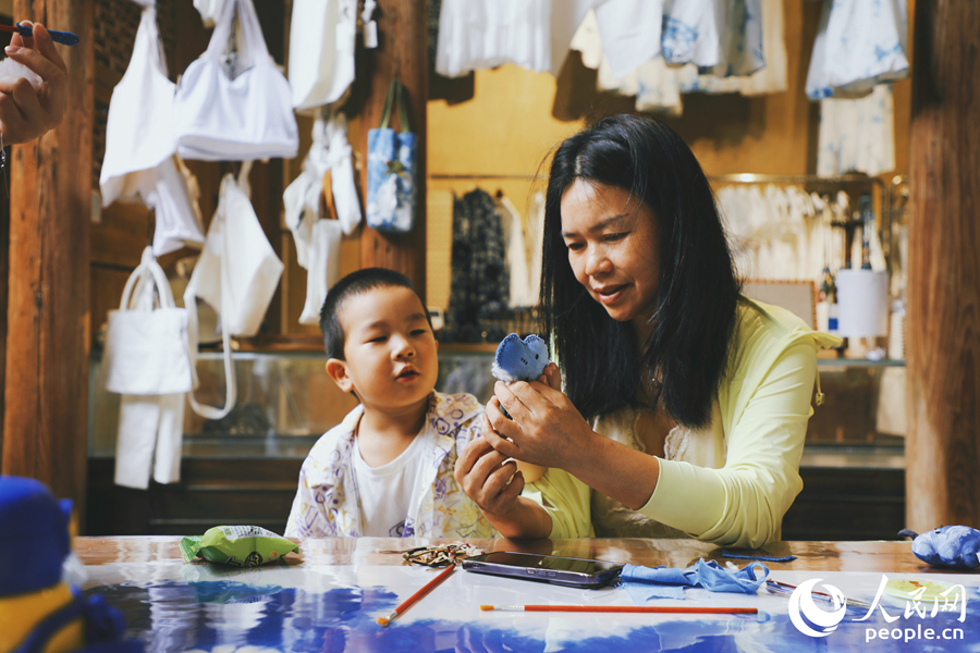 游客在染坊进行扎染体验。人民网 李唯一摄