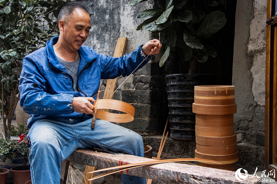 街区内,一位手艺人正在制作蒸笼。人民网 林铭贤摄