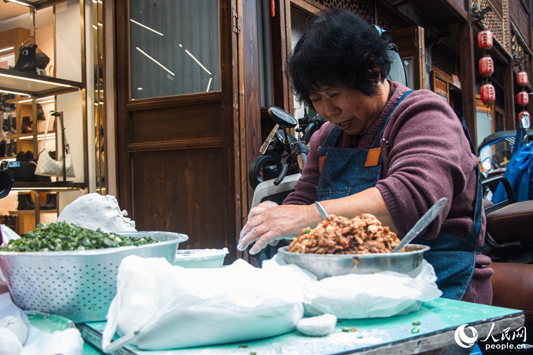 街区内居民正在制作肉丸。人民网 林铭贤摄